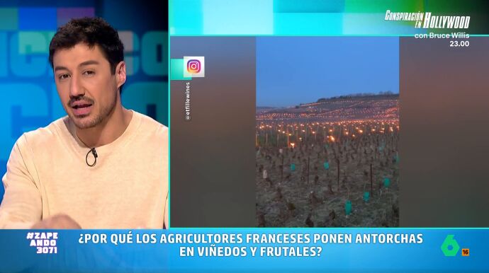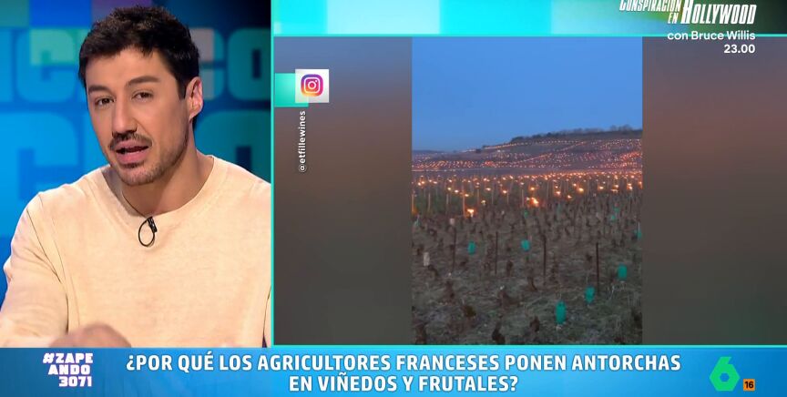 En Francia utilizan una curiosa técnica en los viñedos y campos frutales. Como presenta Isabel Forner, los agricultores colocan antorchas encendidas. "¿Por qué hacen esto los franceses?", pregunta la zapeadora a Francisco Cacho.