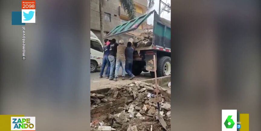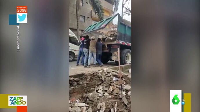 Valeria Ros muestra en Zapeando el vídeo viral de cuatro trabajadores de la construcción que, cuando intentan coordinarse para subir un escombro al camión, acaban recibiendo un fuerte impacto en la cabeza.