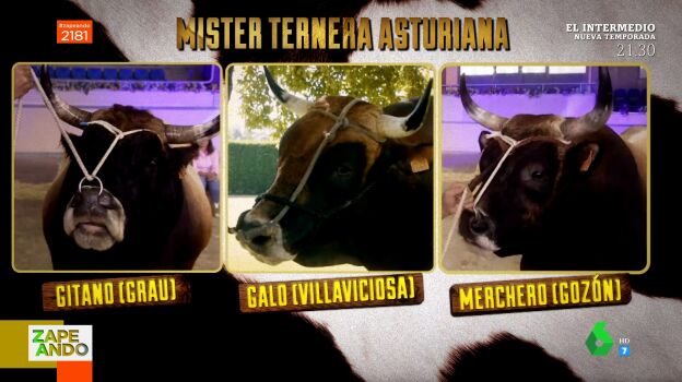 A pesar de que los zapeadores pensaban que los concursos de belleza no estaban ya de moda, lo cierto es que sí. De hecho, en Asturias acaban de elegir al "toro más atractivo del año" en la gala Míster Ternera 2022, informa Dani Mateo a sus compis de Zapeando. "Los tres finalistas estaban de muy buen ver", destaca, y pasa la palabra a los zapeadores para que expliquen las mejores cualidades de estos morlacos y el motivo por el que debían ganar el concurso.