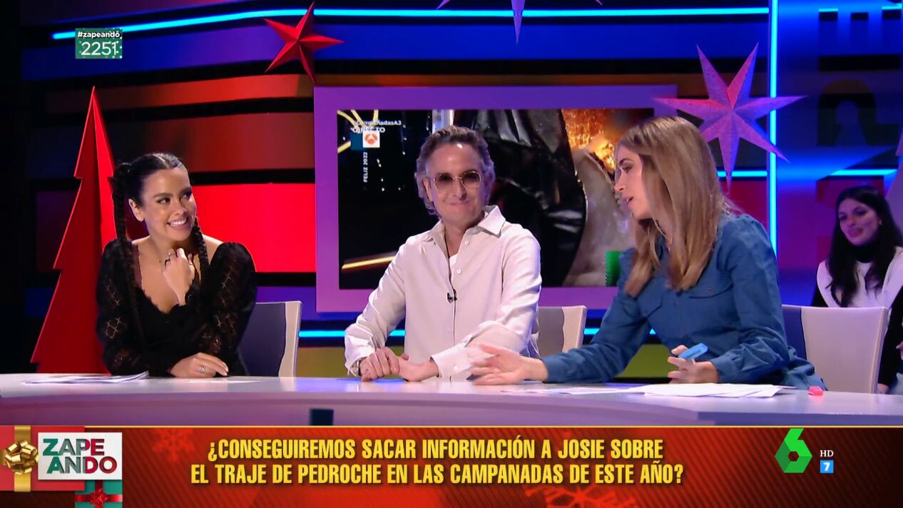 La mesa de Zapeando intenta sonsacar detalles a Josie y Cristina Pedroche sobre el vestido que lucirá en las Campanadas de Nochevieja 2022 y algo consiguen: "Este año las transparencias están conmigo", desvela la zapeadora en este vídeo.
