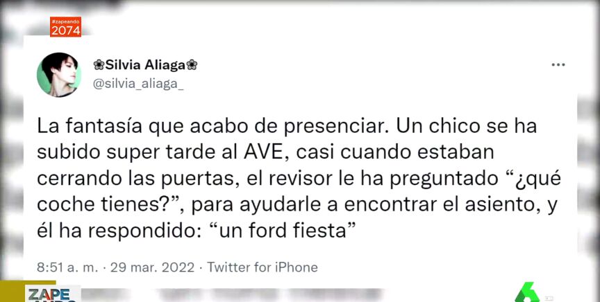 Una chica ha creado un divertido hilo en Twitter sobre un despiste que ha vivido en primera persona en el AVE. Se trata de Silvia Aliaga, que ha contado la surrealista conversación que han protagonizado un chico y el revisor en el vagón. Un chico se ha subido al AVE tarde y cuando el revisor le ha preguntado qué coche tiene para ayudarle a llegar a su asiento, el joven ha contestado que un Ford Fiesta.
