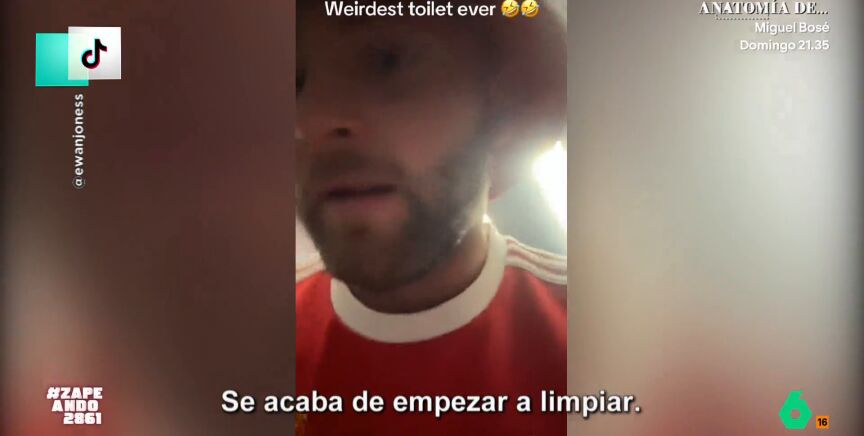 Como explica Cristina Pedroche, uno de estos aficionados se vio sorprendido por un aseo público autolimpiable. "Es un sketch de Mister Bean", afirma la zapeadora. El aficionado del Manchester decidió usar una de estas cabinas pero, se quedó encerrado en su interior.