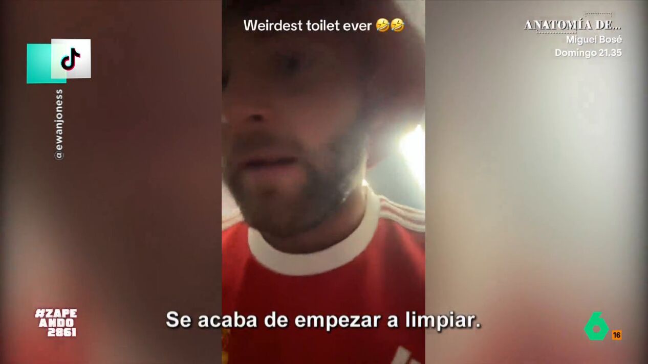 "¿Qué está pasando? ¡Oh, Dios mio!", afirma el joven. El suelo se llena de agua y el chico solo puede comenzar a lanzar improperios mientras busca la puerta para salir. "Amigo, estás en Bilbao, ahí para fregar los baños no abren los grifos, abren las compuertas", afirma Quique Peinado.