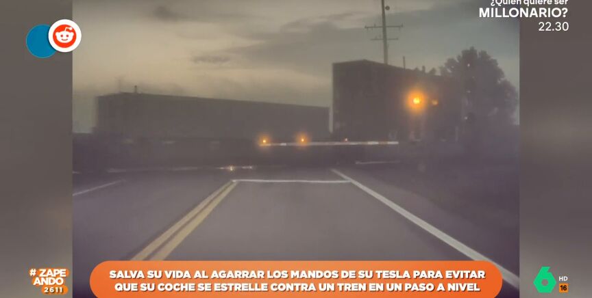 Las cámaras del vehículo han captado el angustioso momento en el que el vehículo se acerca hasta un paso a nivel. El coche no parece aminorar la marcha lo que provoca que su conductor deba tomar una decisión rápida.