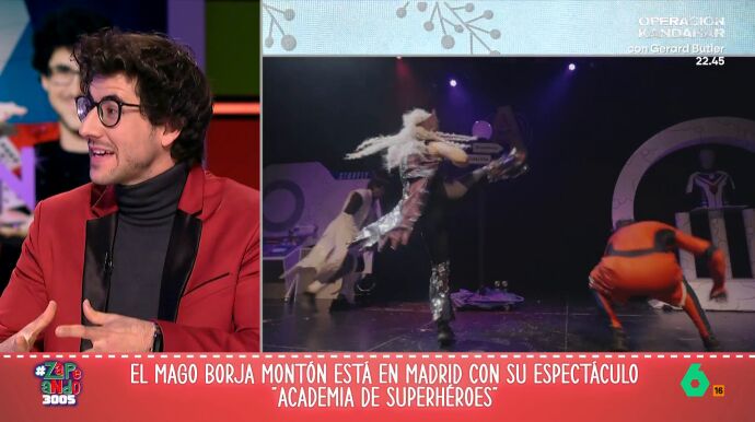 El mago e ilusionista visita Zapeando para presentar su nuevo espectáculo en el Teatro Capitol de Madrid, titulado 'Academia de Superhéroes' "Es un espectáculo, una obra de teatro donde le hemos añadido superpoderes. La magia son superpoderes, la gente viaja en el tiempo, adivina cosas con la mente y alguno incluso hasta vuela", revela Borja Montón.