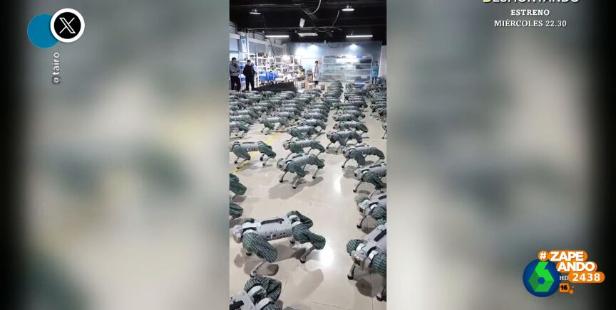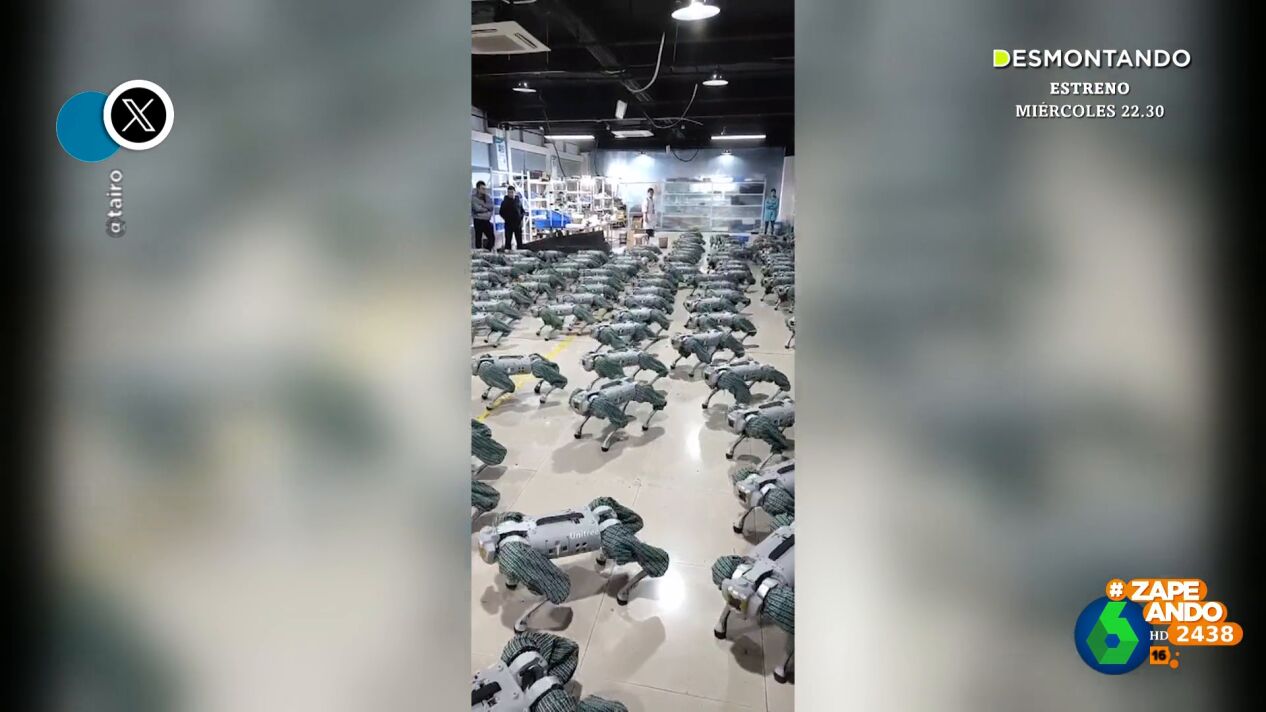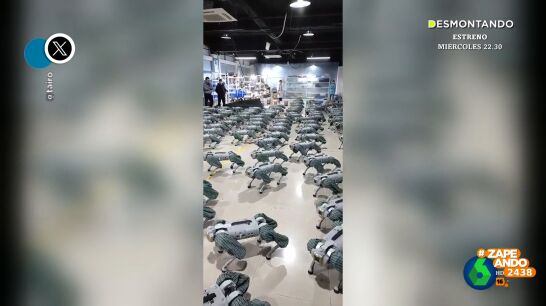 Dani Mateo trae a Zapeando "inquietantes" imágenes de una sala llena de perros-robot y explica que, aunque ya los habíamos visto alguna vez y se había presentado como el animal de compañía del futuro, verlos ahí juntos, da "miedo", afirma, y añade que "parece un ejercito preparado para atacar a la humanidad ya".