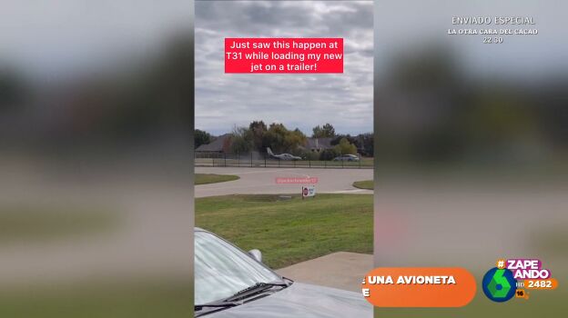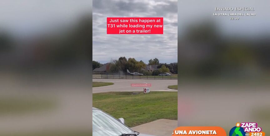 Un chico de 14 años capta el momento en el que una avioneta se sale de la pista de aterrizaje e incluso del recinto del aeropuerto y choca contra un coche que circulaba por la carretera.