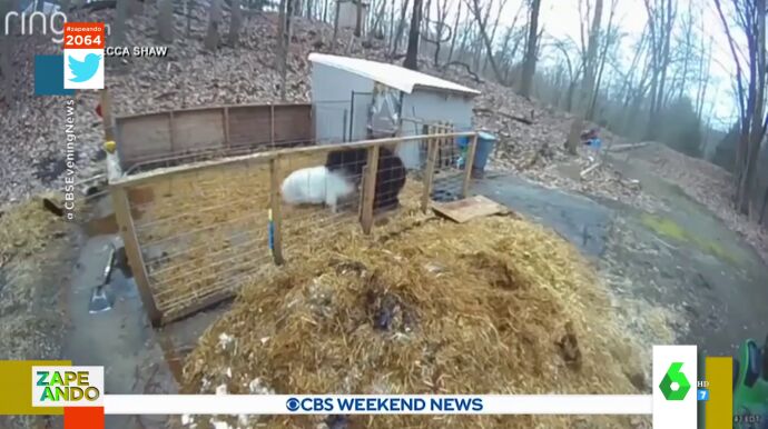 En el vídeo principal de la noticia puedes ver cómo un oso intenta dar caza a un cerdo, pero este recibe refuerzos en el último momento. "Estaba su primo de zumosol en la caseta. ¡Qué miedo da el cerdo!", comenta el presentador. Y, es que, como bien señala María Gómez: "¿El cerdo tiene cresta?". Dale al play para descubrir quién sale ganando en este enfrentamiento.