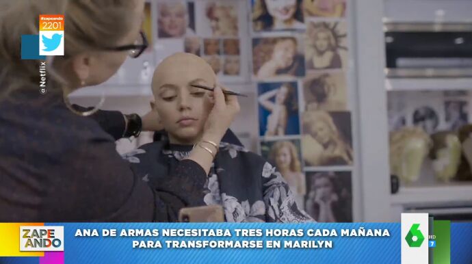También tuvo que depilarse y decolorarse las cejas, colocarse unas lentillas azules y unas pestañas azules que modificaban la forma de sus ojos. Además, se colocaba el lunar en la mejilla izquierda y se ponía una peluca rubia platino hecha a medida. Cada noche, necesitaba otra media hora para quitárselo todo y volver a ser ella. Puedes ver esta increíble transformación paso a paso en el vídeo principal de esta noticia, donde los zapeadores destacan el papel que hace la actriz e, incluso, reflexionan sobre que gane un Oscar.