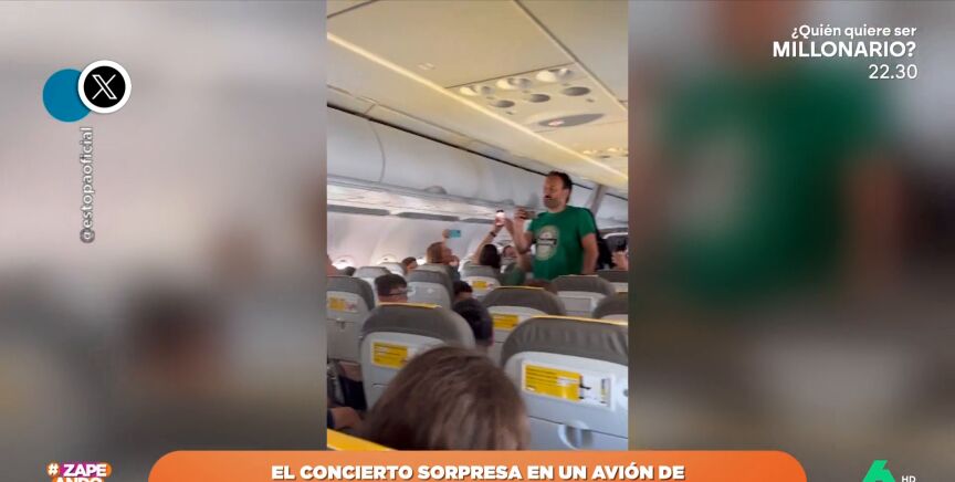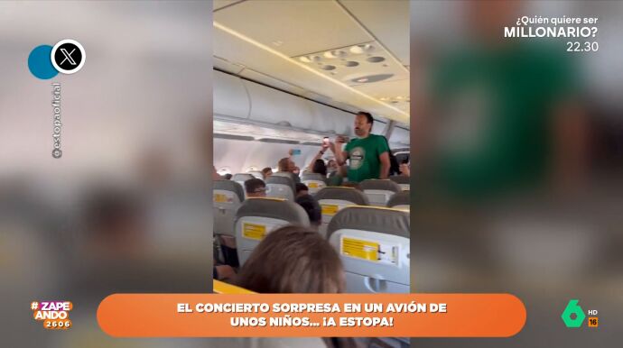 Unos niños de un colegio asturiano se arrancan a cantar 'Como Camarón', de Estopa, durante un vuelo en el que también viajan los hermanos Muñoz. Puedes ver este momento en este vídeo de Zapeando.