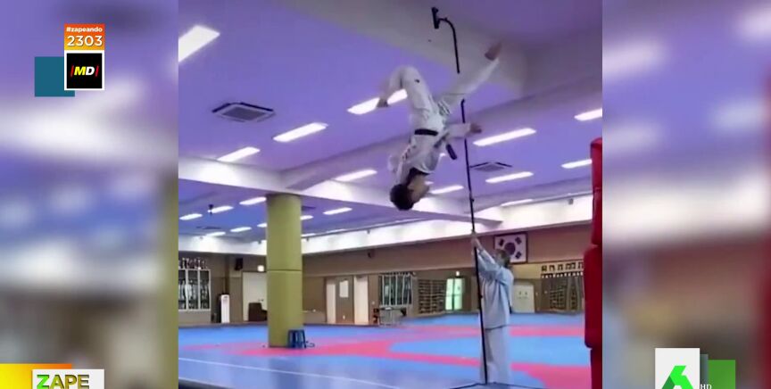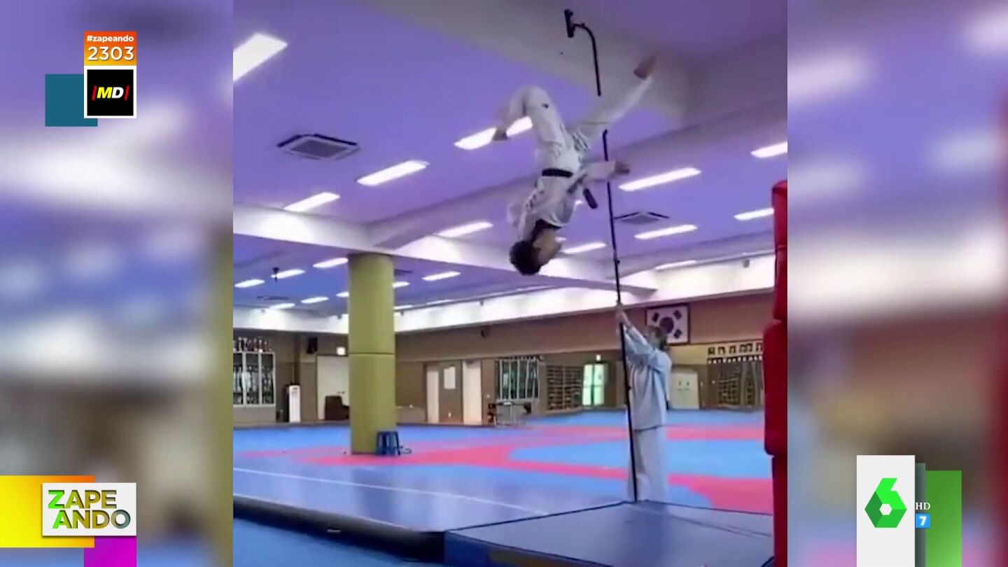 Se impulsa con una voltereta, gira sobre sí mismo en el aire y golpea una tabla con el pie. Es la secuencia que realiza este joven para ejecutar esta espectacular patada voladora que nos presenta Valeria Ros en Zapeando. "Llega tan alto que parece que está volando", señala Valeria Ros.
