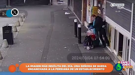 El inesperado percance de una señora cuando se levanta la persiana de un supermercado