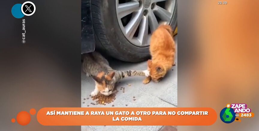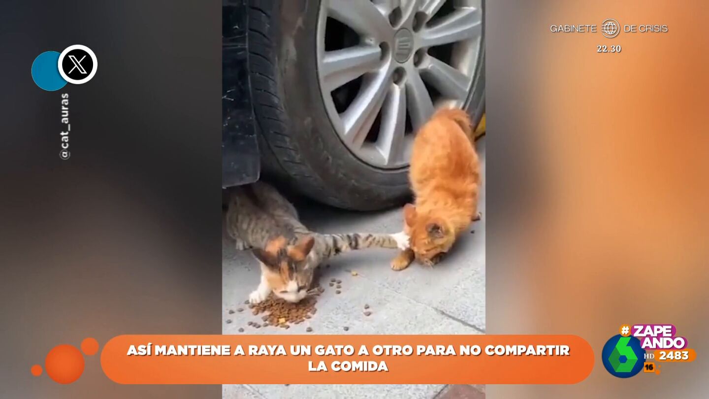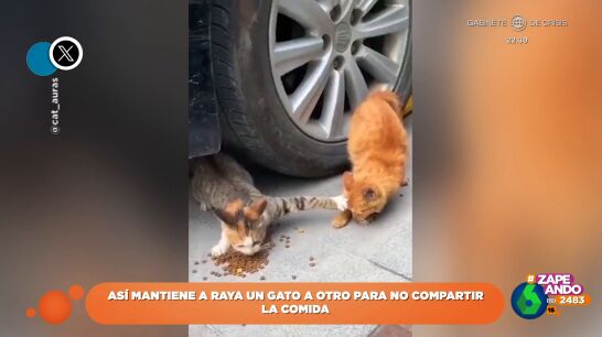 Un gato da con la clave para que otros no se acerquen a su comida. Este estira su pata y la coloca sobre otro, que se acerca para compartir el almuerzo, para impedírselo. Puedes verlo en este vídeo de Zapeando.