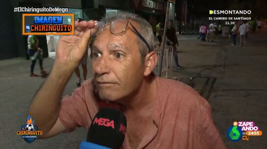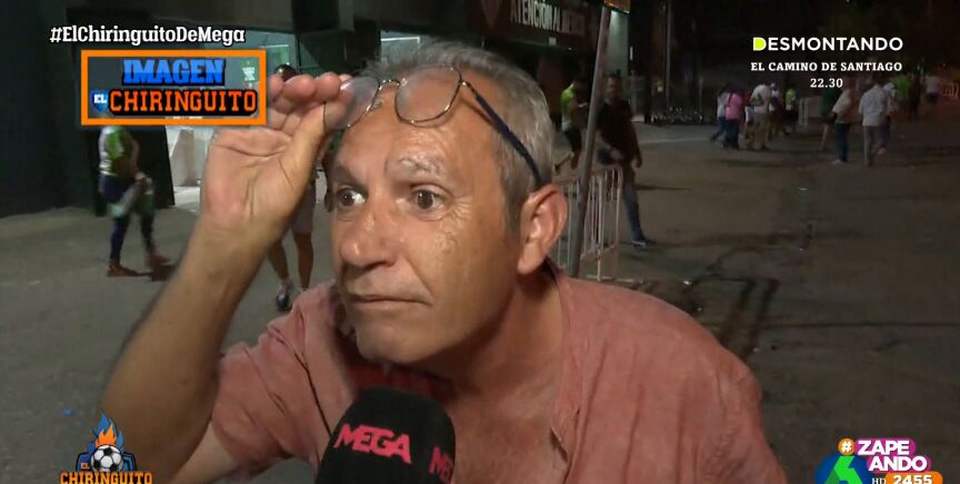 Un seguidor del Betis confiesa a un reportero de 'El Chiringuito', el programa presentado por Josep Pedrerol, que lleva el escudo de su equipo en su cuerpo y cuenta que se lo puso tras la retirada de Joaquín.