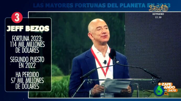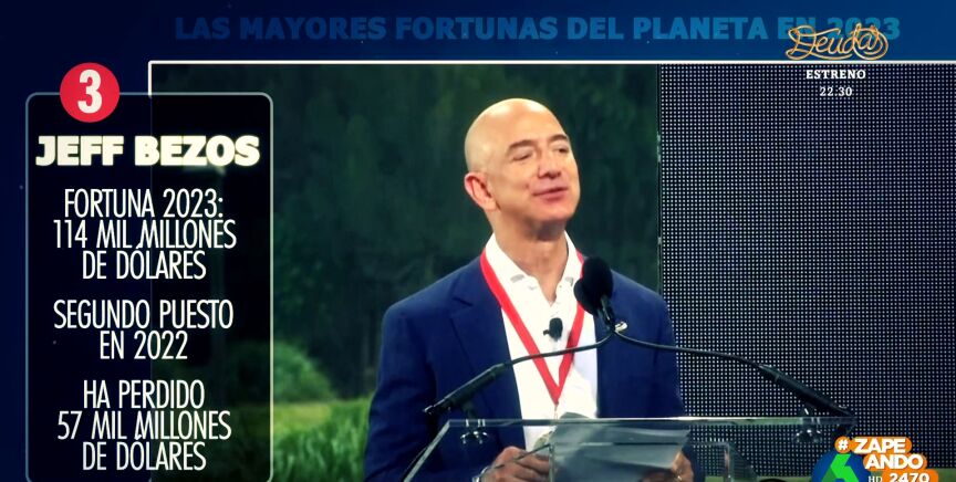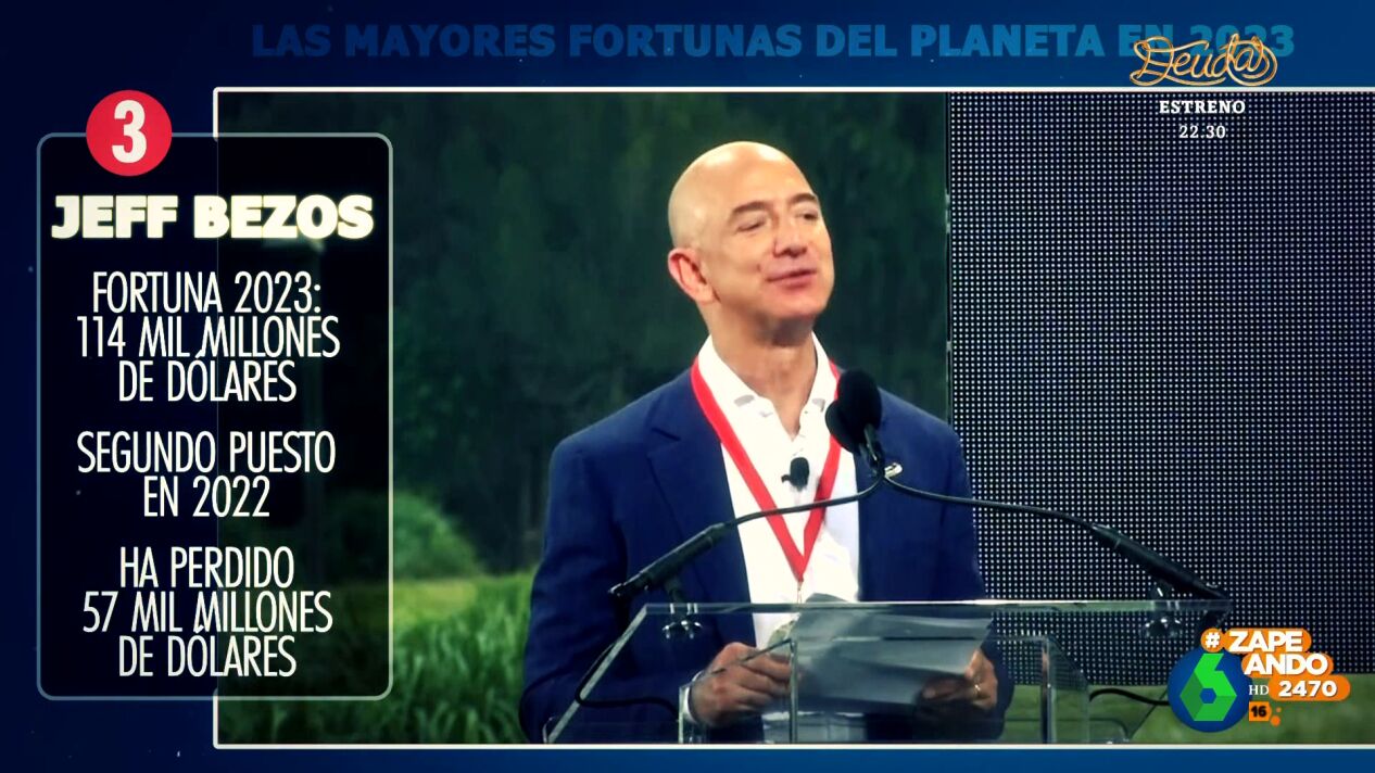 El dueño de Tesla y X, ante conocido como Twitter, baja un escalón y este año ocupa el segundo lugar entre los más ricos del mundo. Su fortuna pasa de 219.000 millones a 180.000 millones de dólares, aunque Dani Mateo señala que lo que no cambia es que "sigue haciendo el ridículo cuando baila".