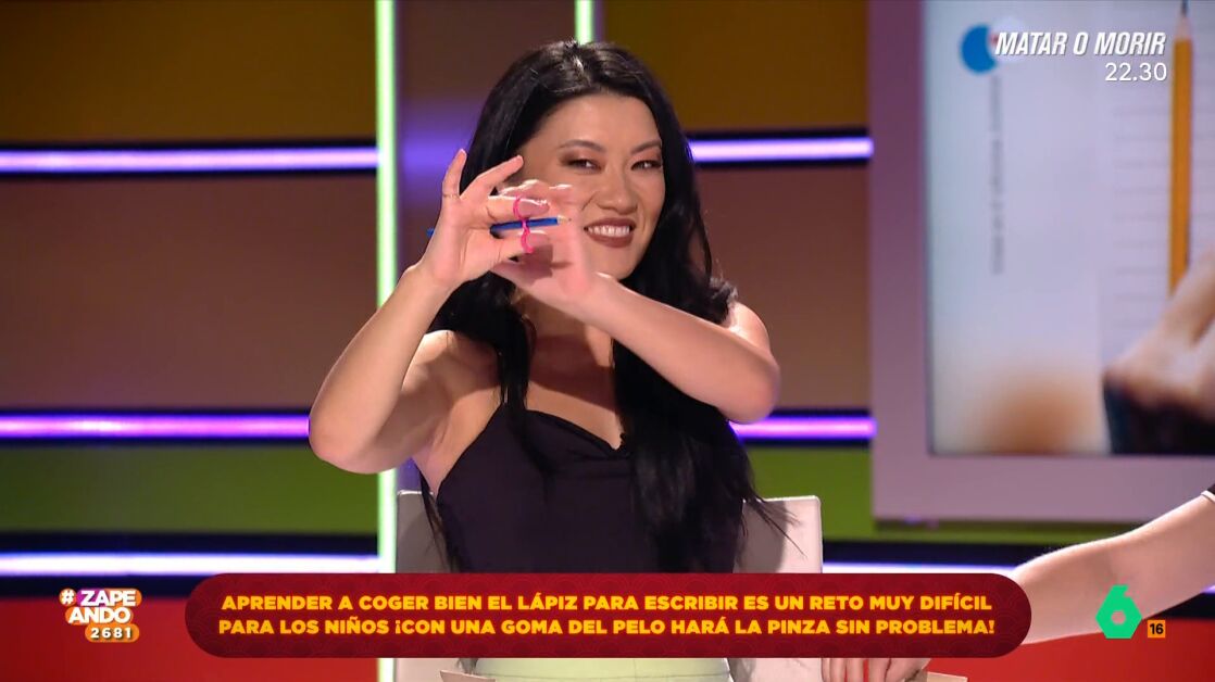 En su visita a Zapeando, Jiaping sorprendió a los zapeadores y espectadores con sus nuevos trucos para facilitar la vuelta al cole. Uno de los primeros consejos que ofreció fue una técnica poco convencional para enseñar a los niños a escribir y coger de manera correcta los lápices.