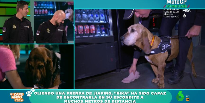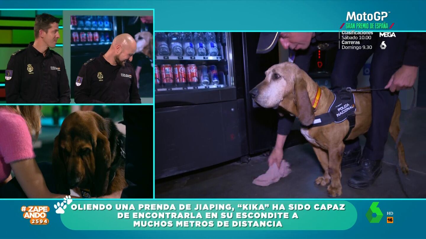 Además, Zapeando ha puesto a prueba a uno de estos sabuesos. En concreto a Kika. Jiaping se ha escondido en una zona del recinto y, gracias a una prenda de la reportera, la perra ha ido siguiendo su rastro hasta encontrarla. Kika, durante su búsqueda, ha ladrado en diferentes puntos para indicar a su policía acompañante por dónde olía el rastro de la reportera.