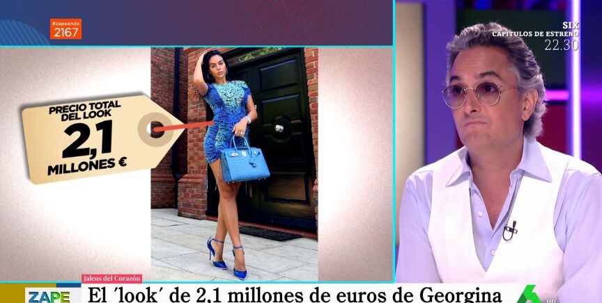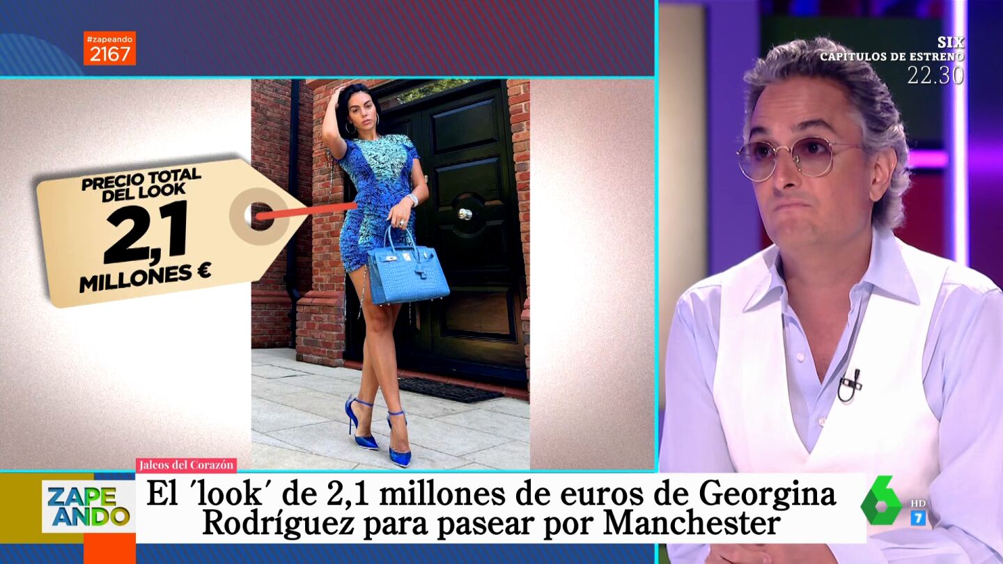 Josie analiza en el plató de Zapeando el look de Georgina Rodríguez valorado en más de 2,1 millones de dólares con el que se ha pasado por Manchester. Pero, ¿qué llevaba para echarse encima ese dineral? Un vestido de Stella Mccartney de 1.900 euros, las sandalias 755 euros, y el bolso 94.000 euros, "más caro que un piso" como destaca Quique Peinado.