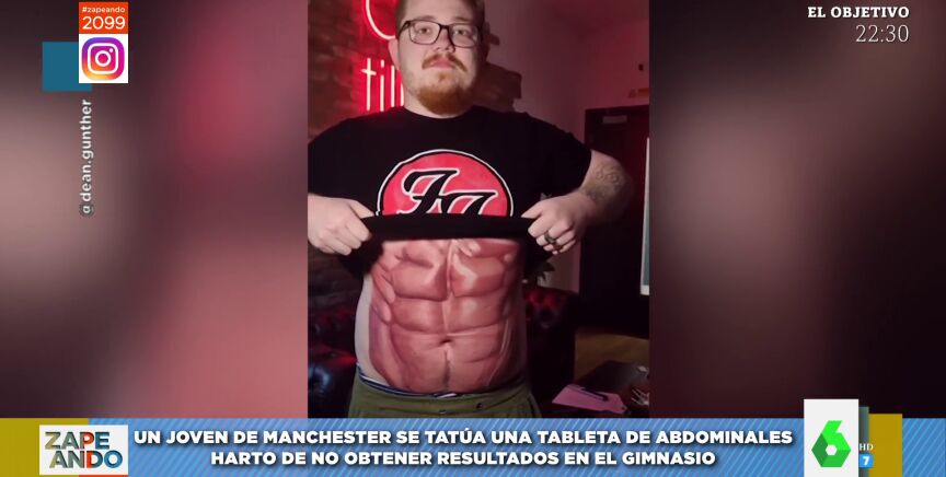 "¿Estáis hartos de ir al gimnasio y no obtener resultados?", pregunta Dani Mateo a sus compañeros, antes de mostrar su vídeo viral del día, en el que un joven de Manchester, "harto" de ir a entrenar y al ver que no conseguía el resultado esperado, tomó una decisión drástica: acudir a un tatuador para que le tatuase una tableta de abdominales.