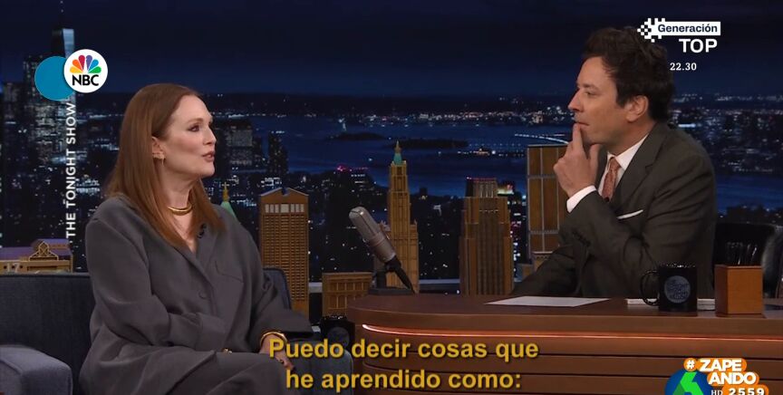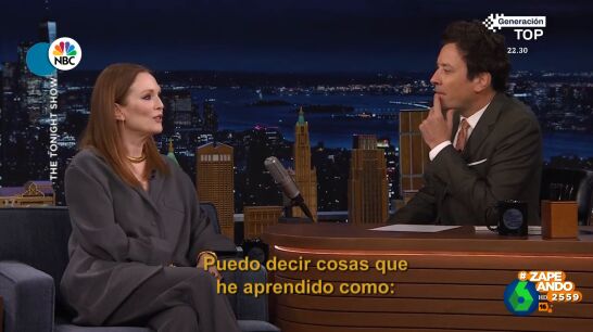 Julianne Moore acude al programa de Jimmy Fallon, donde cuenta que ha estado en España trabajando, y el presentador le pregunta si sabe hablar español. "Lo intento. Estoy aprendiendo", expresa, y añade: "Estoy trabajando duro con Duolingo".