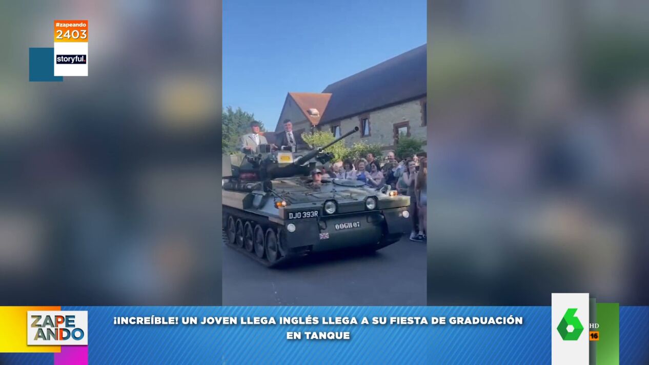 Un joven de Reino Unido se vuelve viral por su curiosa forma de presentarse en su graduación a lomos de un tanque. "Los compañeros flipaban y sus profesores también", comenta Valeria Ros.