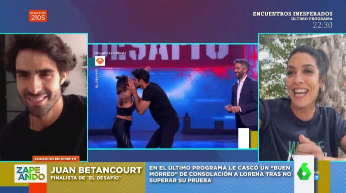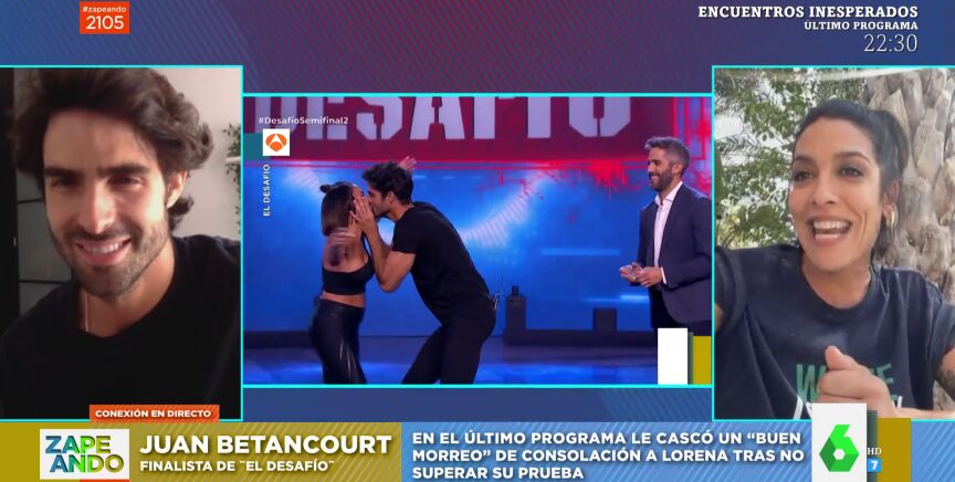 Elmorreo de Juan Betancourt a Lorena Castell en El Desafío ha sido uno de los momentazos del concurso. Ahora, el modelo explica por qué lo hizo y como fue ese momento en este vídeo de Zapeando. Además, por sorpresa, Dani Mateo conecta en directo con la otra parte del beso: Lorena Castell, quien reconoce que fue algo que no se esperaba para nada.