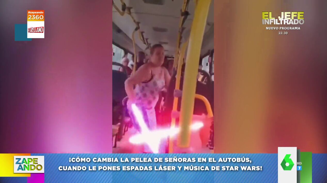 Ahora sus herramientas son espadas láser y, de ambiente, suena la banda sonora de la saga. "¿Habéis visto cómo cambia la historia?", comenta el zapeador, que añade que el autobús es el Halcón milenario y de esa pelea "depende la galaxia".