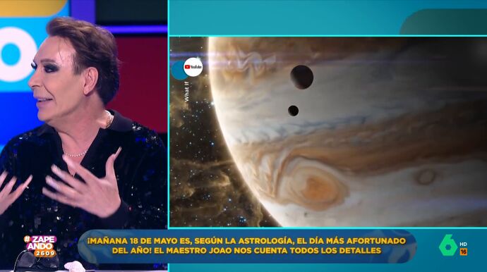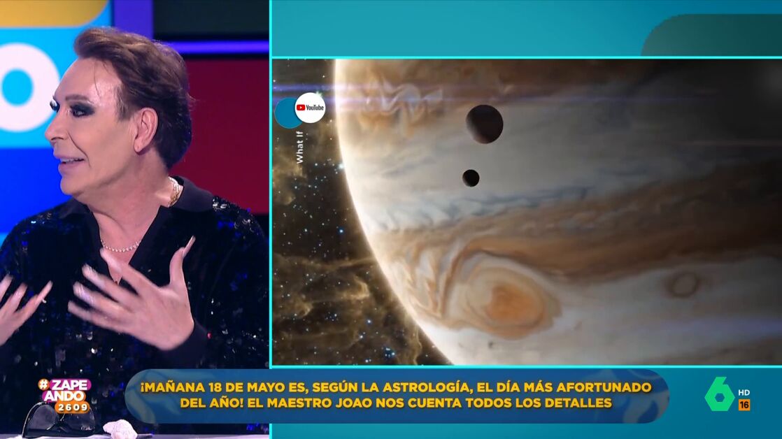El 18 de mayo es, astrológicamente, es el día más afortunado del año. El Maestro Joao visita Zapeando para contar el porqué de esta afirmación. El tarotista afirma que "es más complicado de explicar que lo mío". "Hay una alineación de Júpiter con el Sol que focalizado esa energía, juntada con lo que proyecta sobre la tierra, que nos influye por la parte tan grande que tenemos de agua e influye en esa energía que tenemos, hace que sea una proyección de energía muy positiva".