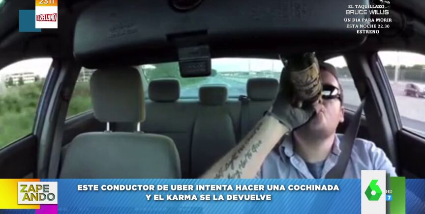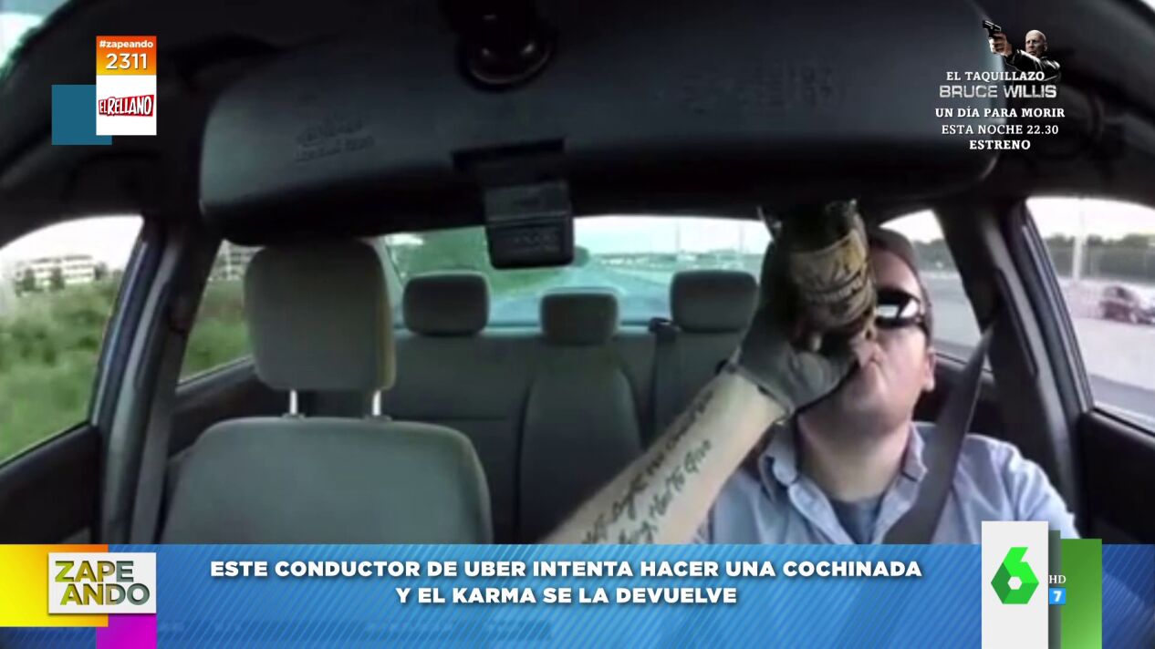 Un conductor de UBER se ha vuelto viral después de intentar tirar a través de la ventanilla una botella de cristal y reventarla porque estaba cerrada. La cómica reacción al darse cuenta en este vídeo de Zapeando.