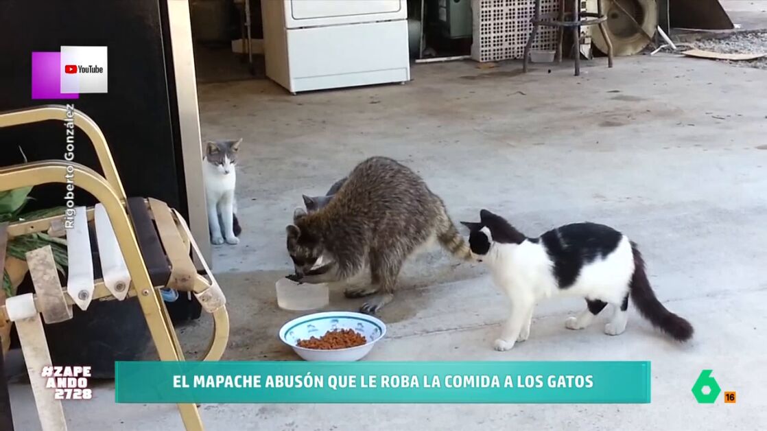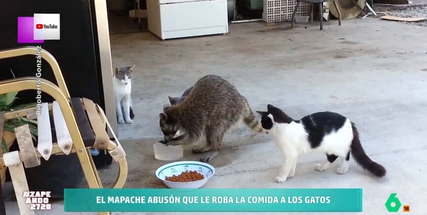 Estos animales demuestran que no solo les gusta robar en coches, también les gusta robar comida de otros animales. Como se ve en el vídeo, un mapache no se dejó intimidar por los tres gatos que estaban comiendo de un bol de pienso. El animal, además, demuestra ser muy limpio ya que antes de meter la mano en el recipiente con pienso se lava las manos en el bol de agua. Los gatos solo pueden quedarse mirando al mapache y esperar a que termine su festín. "Tiene el carnet de manipulador de alimentos", afirma María Gómez.
