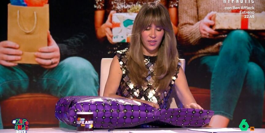 "Luce cojín", comenta Nacho García al verlo. "Cojín o pijamita de los que a ti te gustan", añade Maya Pixelskaya. Como se puede ver en las imágenes, la zapeadora se sorprende, primero, de que el regalo está muy bien envuelto.