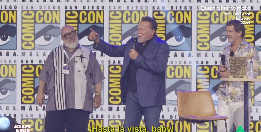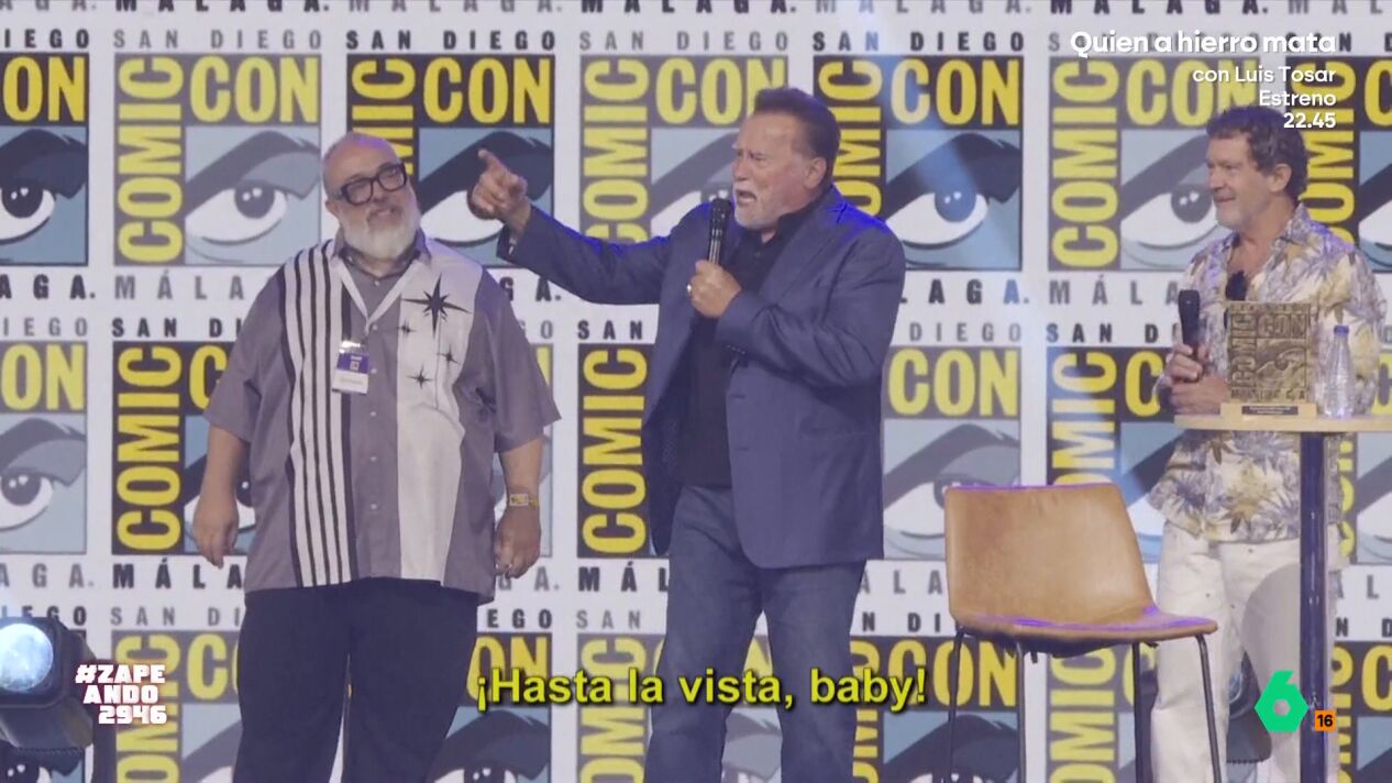 Zapeando analiza en este vídeo uno de los grandes momentos de la San Diego Comic Con de Málaga: el homenaje de Antonio Banderas y Álex de la Iglesia a Arnold Schwarzenegger y su frase "hasta la vista, baby".