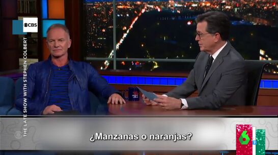 Un cuestionario que planteó al cantante Sting en 'The Late Show' y que incluye preguntas tan variopintas cómo cuál es el mejor sándwich, el animal más aterrador... y otras más profundas cómo qué ocurre cuando morimos. En el vídeo que ilustra estas líneas puedes descubrir cuáles son las preguntas de Colbert y las respuestas de Sting.