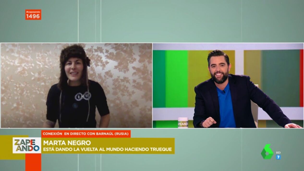 Dani Mateo entrevista en Zapeando a Marta Negro, una joven que está dando la vuelta al mundo haciendo trueque. La joven nos cuenta en qué consiste ese trueque y cómo ha conseguido viajar y encontrar alojamiento sin gastar dinero.