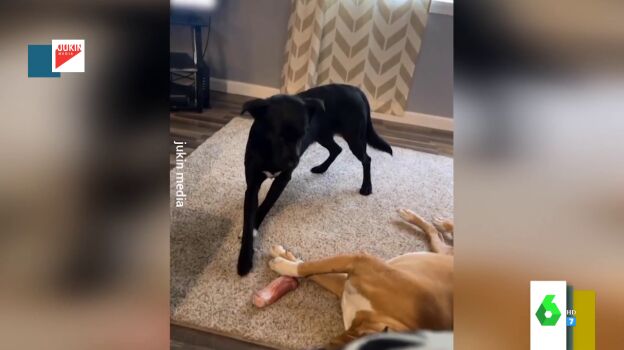 La astucia de un perro para robarle el hueso a otro mientras duerme