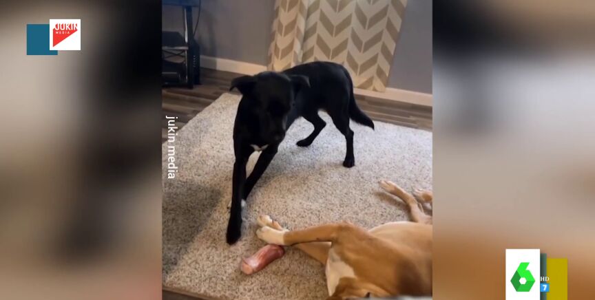 Valeria Ros muestra el vídeo de uno de los ladrones más sigilosos que han pasado por Zapeando. Es un perro que aprovecha que otro perro está dormido para robarle un hueso. Lo va agarrando con mucho cuidado y cautela para que el otro no se despierte.