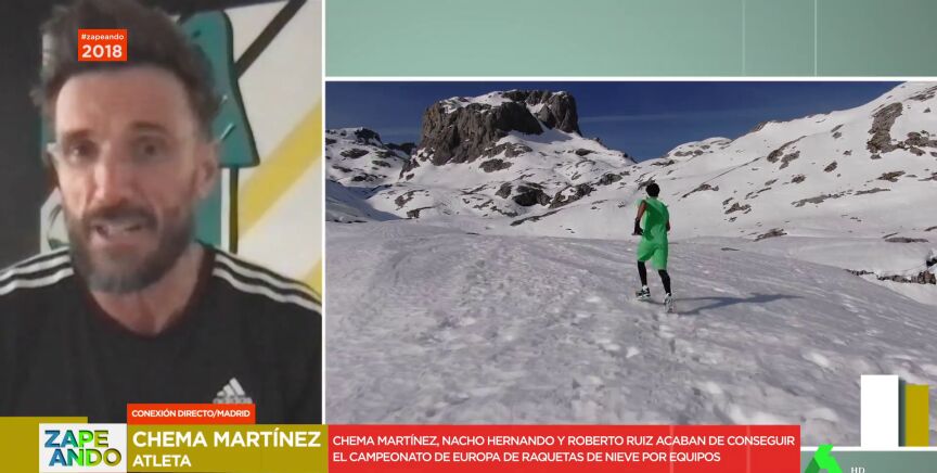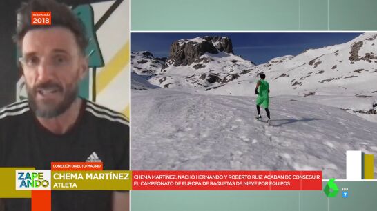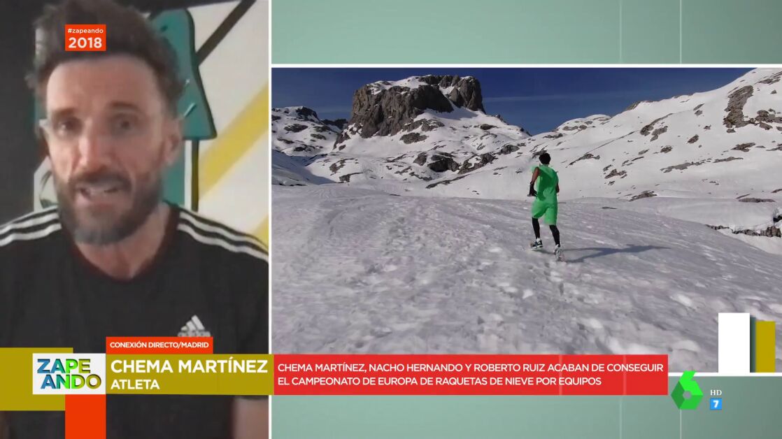 Chema Martínez, Nacho Hernando y Roberto Ruiz acaban de conseguir el campeonato de Europa de raquetas de nieve por equipos. Martínez entra en directo en Zapeando para hablar de ello en este vídeo.