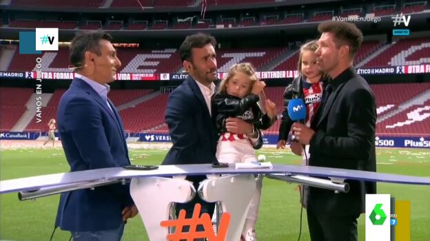 Las hijas del Cholo Simeone protagonizan este divertido vídeo viral al interrumpir la entrevista de Juanma Castaño a su padre y cantar el himno del Atlético. Los zapeadores no pueden contener la risa al ver el cómico momento.