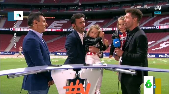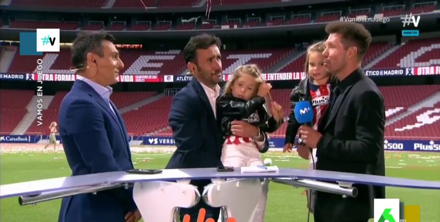"Esta otra también quiere seguir en la tele, ven que te cojo yo", destaca Juanma Castaño a la pequeña, que es levantada por el periodista. Durante un rato, Castaño sostiene en brazos a la hija del Cholo, una cómica situación que los zapeadores analizan entre risas en directo: "Solo puedo mirar la cara de Juanma Castaño, le tiemblan un poco los brazos". Puedes ver la divertida situación y el enternecedor momento en el que las pequeñas cantan el himno del atlético en el vídeo principal de esta noticia.