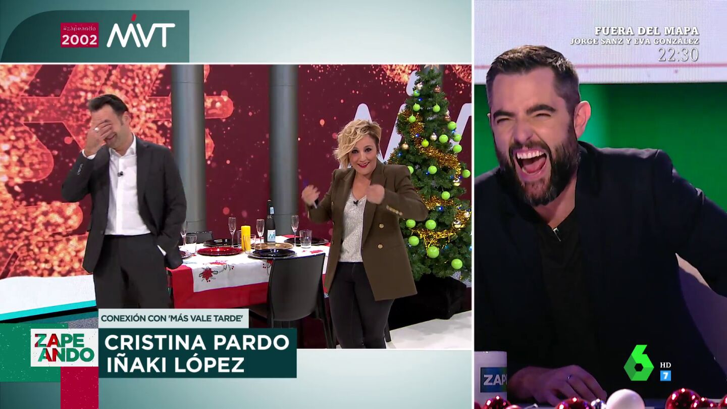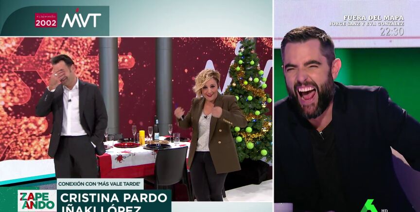 Dani Mateo conecta antes de terminar Zapeando con el plató de Más Vale Tarde, donde Cristina Pardo e Iñaki López avanzan los temas de los que hablarán en el programa. Los presentadores de MVT enseñan el plató con la decoración de Navidad a sus vecinos de Zapeando.
