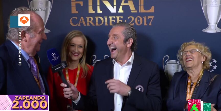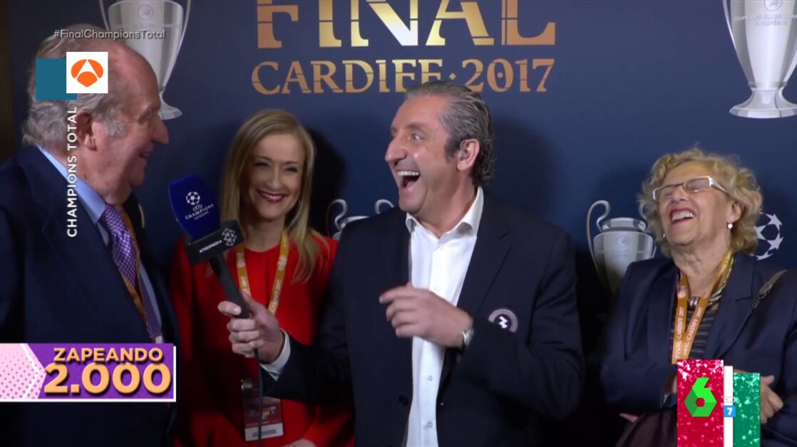 Este viernes, Zapeando cumple 2.000 programas y, para celebrarlo, los zapeadores repasan momentazos emitidos durante su historia. Por ejemplo, Lorena Castell muestra en plató uno ocurrido en 2017 en la previa de la final de la Champions entre el Real Madrid y la Juventus de Turin, cuando Josep Pedrerol entrevistó en el palco al rey emérito, y éste descubrió el verdadero motivo por el que se encontraba allí.