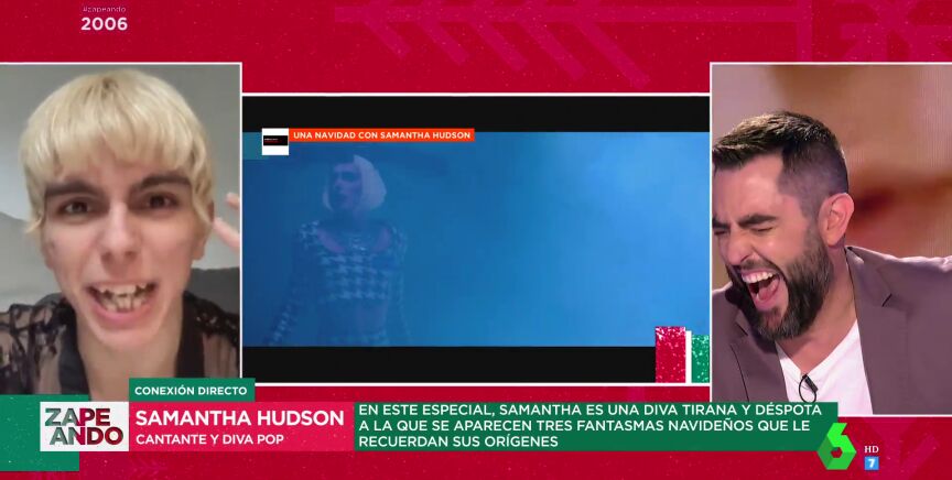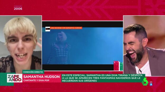 Dani Mateo conecta en directo a través de una videollamada desde el plató de Zapeando con Samantha Hudson, protagonista del especial de Navidad de ATRESplayer: 'Una Navidad con Samantha Hudson'.En este especial, Samantha es una diva tirana y déspota a la que se aparecen tres fantasmas navideños que le recuerdan sus orígenes. La artista y diva pop protagoniza un cómico momento al aparecer en pantalla con un vapeador.