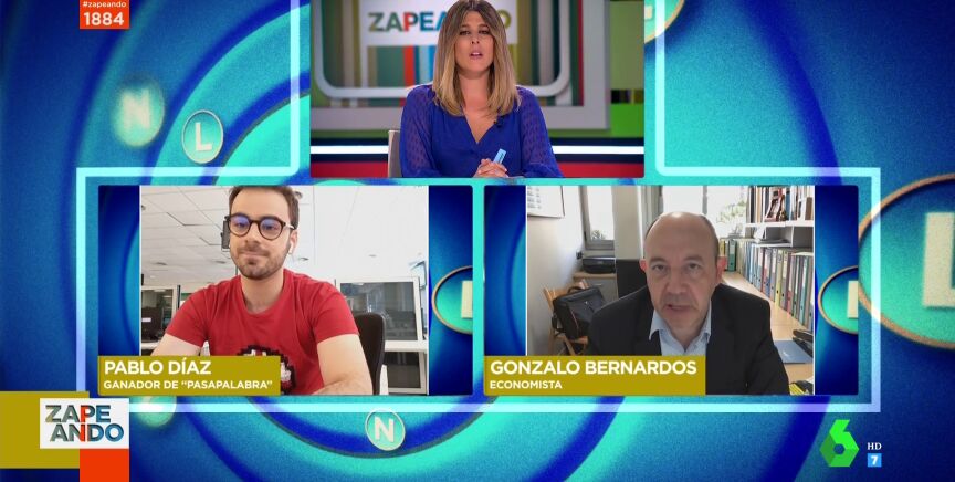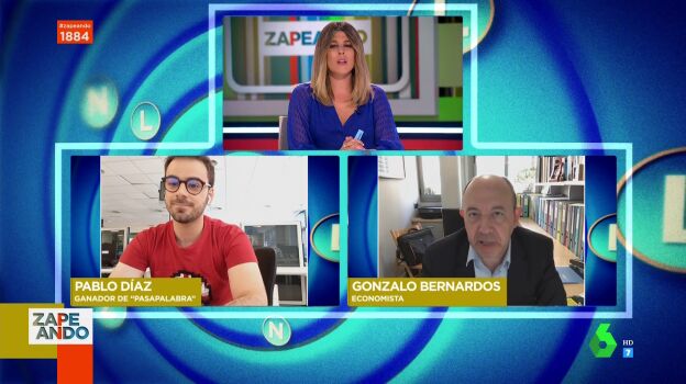 Gonzalo Bernardos, economista, ha entrado en directo en Zapeando para felicitar a Pablo Díaz por ganar El Rosco de Pasapalabra y le ha dado unos consejos sobre en qué debería gastar el dinero del bote. "Es un momento óptimo para comprar una casa. Está a punto de despegar el precio de los pisos y comprarlo ahora va a ser una magnífica inversión", ha afirmado.