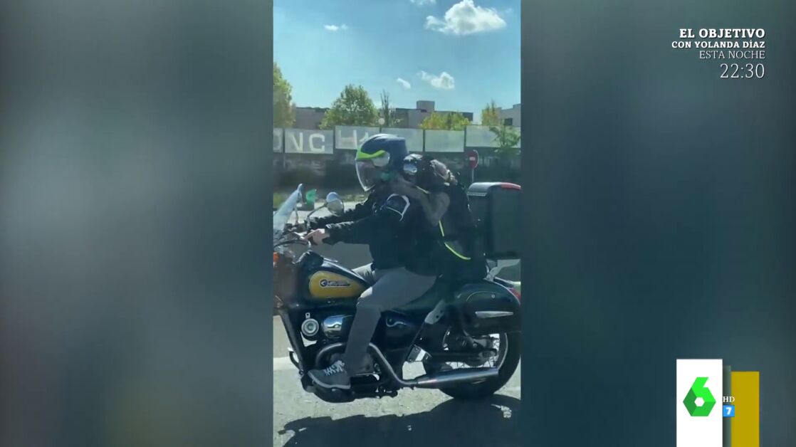 En la imagen, grabada por una mujer que captura el vídeo desde su coche, se puede ver cómo el perro, perfectamente equipado, está sentado completamente recto en la parte trasera de la moto agarrándose a la espalda de su dueño. "Ay, qué cosa, qué monos" se escucha en el vídeo.