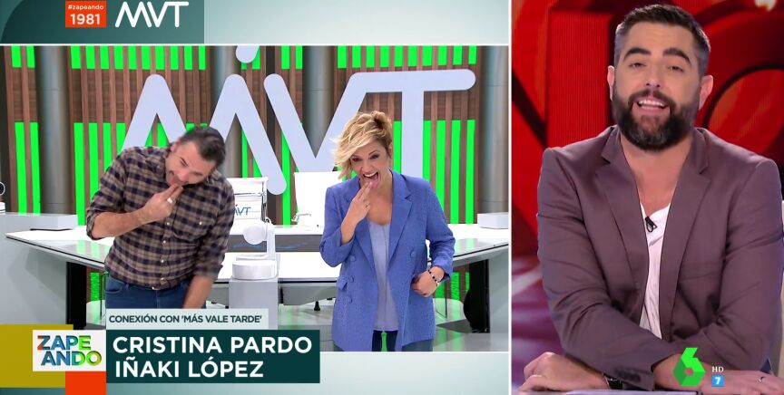 Como es habitual, Dani Mateo ha pasado el testigo a Cristina Pardo e Iñaki López, que presentan el programa de Más Vale Tarde que empieza al acabar Zapeando. Pero en esta ocasión, Dani Mateo ha querido preguntarles los temas de su programa mientras le hacía gestos extraños, imitando a Albert Cavallé, el 'estafador del amor' que un día antesprotagonizó una tensa entrevista en MVT.
