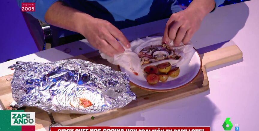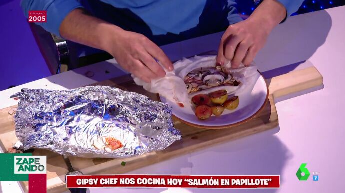 Gipsy Chef vuelve a Zapeando por Navidad. El cocinero trata de mostrar una rápida receta para esta Nochebuena hecha con un lomo de salmón "recién traído de Alaska". Se trata de una receta de salmón en papillote que se pueden hacer en sartén o en horno.