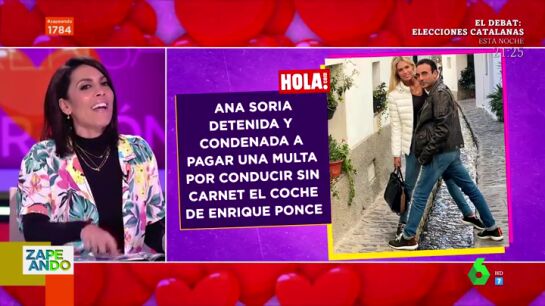 En su habitual repaso de las portadas de las revistas del corazón, Lorena Castell analiza la detención de Ana Soria, pareja de Enrique Ponce, tras conducir sin carnet junto al torero. "Es muy fuerte", destaca Lorena Castell, que explica que al ser pillados por la Guardia Civil cambiaron sus asientos para no ser multados.