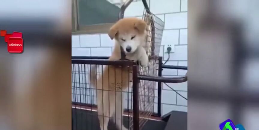 "Mirad qué magia de perro", afirma el zapeador, "intenta caminar por la cinta y como lo pasa mal para seguir el ritmo ha encontrado la solución perfecta, colgarse de la barra".