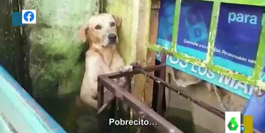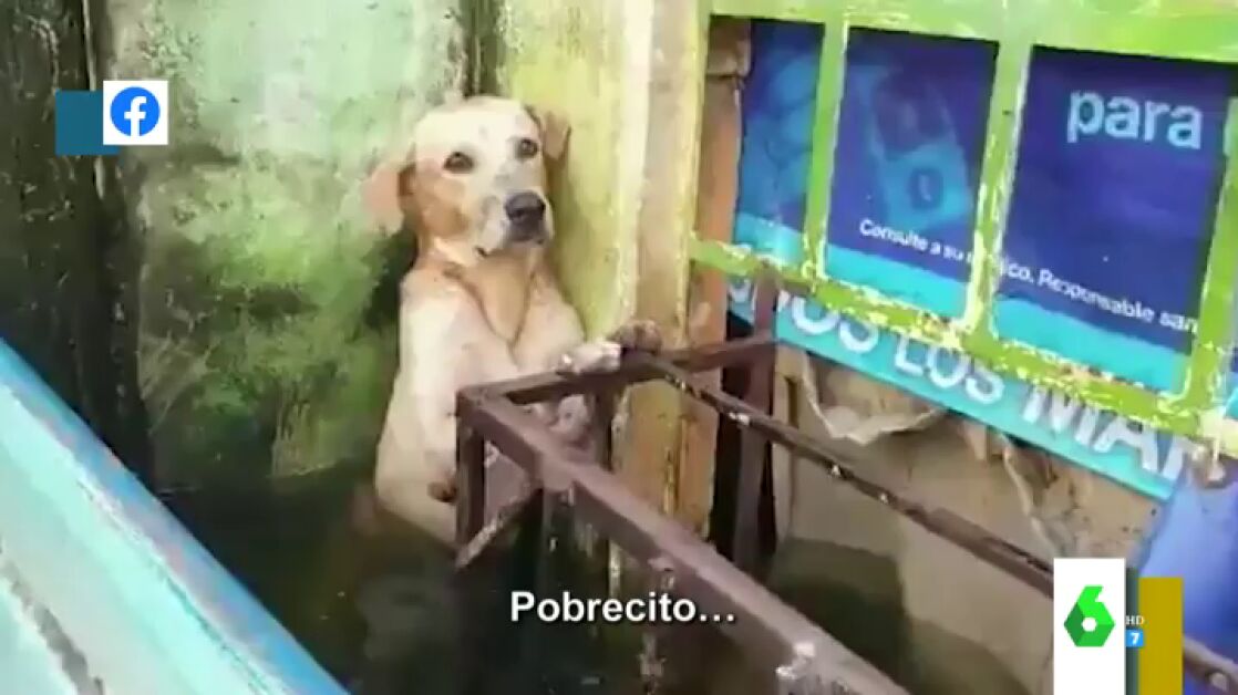 En las imágenes se puede ver cómo el perro se agarra a un edificio para no ahogarse mientras varias personas se acercan para rescatarle con una lancha.