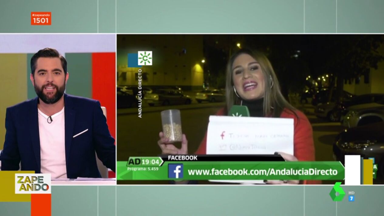 "¿Cómo estás sujetando el micrófono?", le preguntó el presentador del programa, a lo que la reportera respondió: "Tengo tres manos hoy". Y es que en el vídeo se puede ver a la periodista Teresa Núñez Caparrós sujetando una libreta, mientras otra mano sujeta un micrófono y una tercera un bote de garbanzos.
